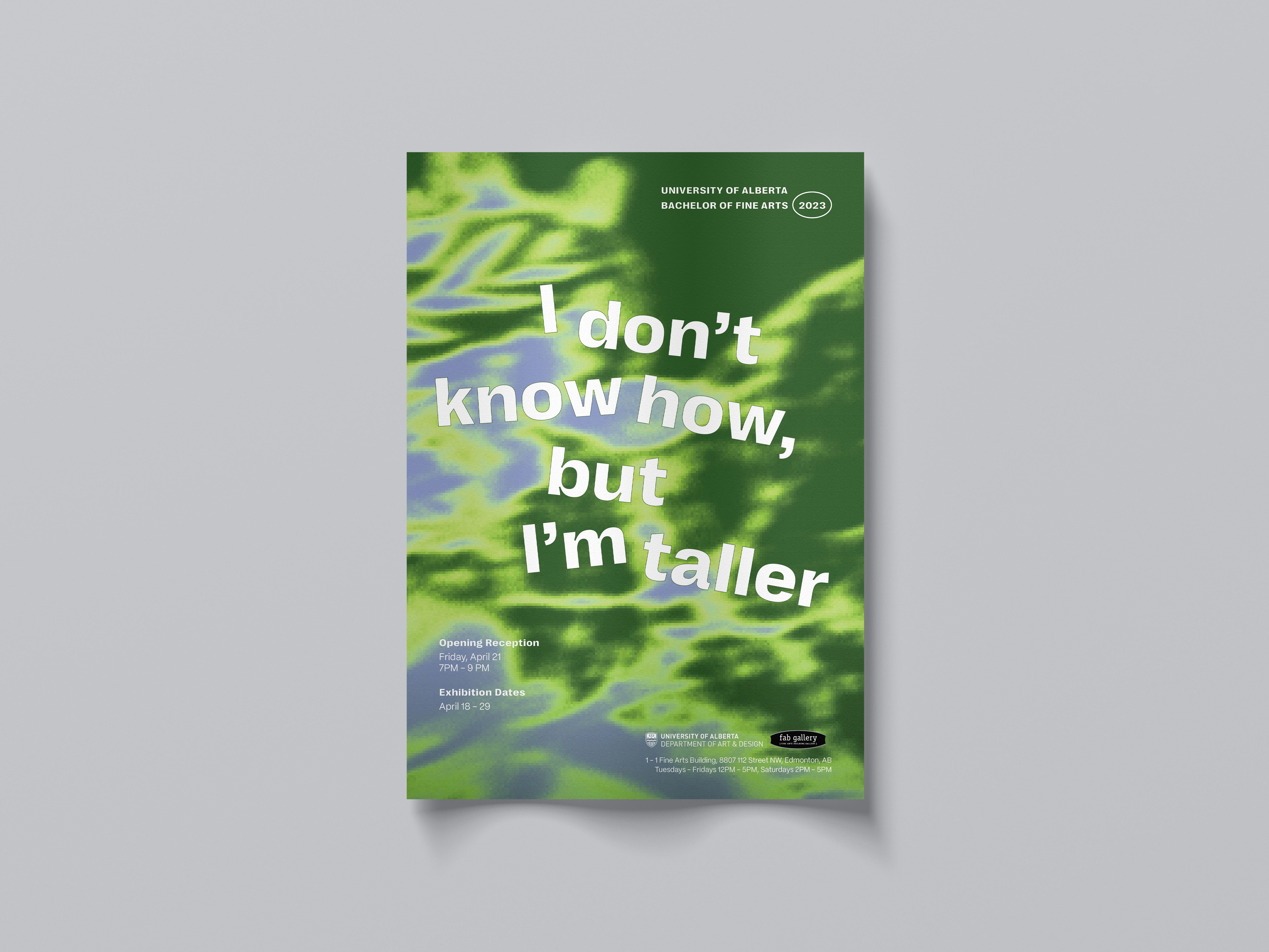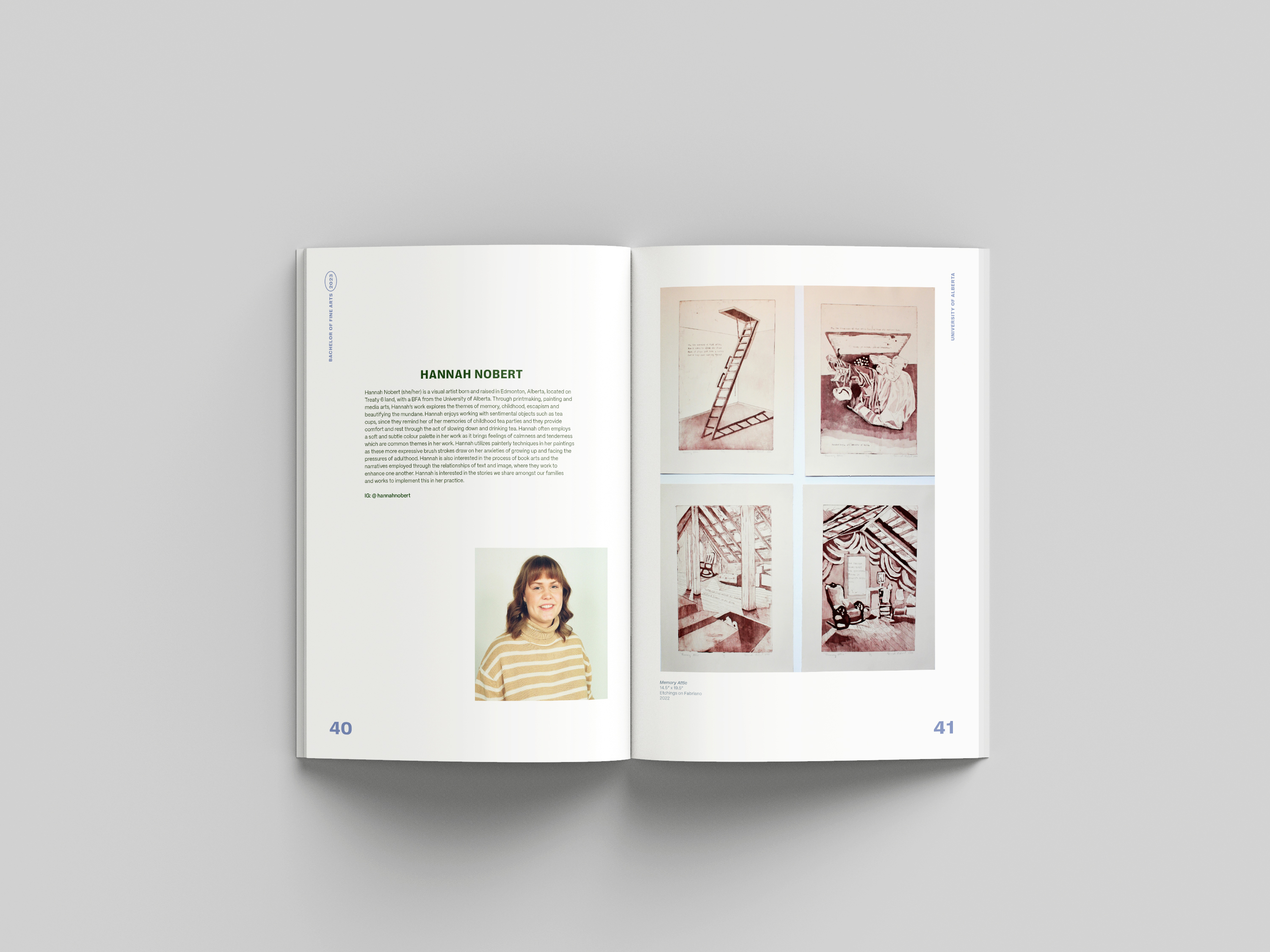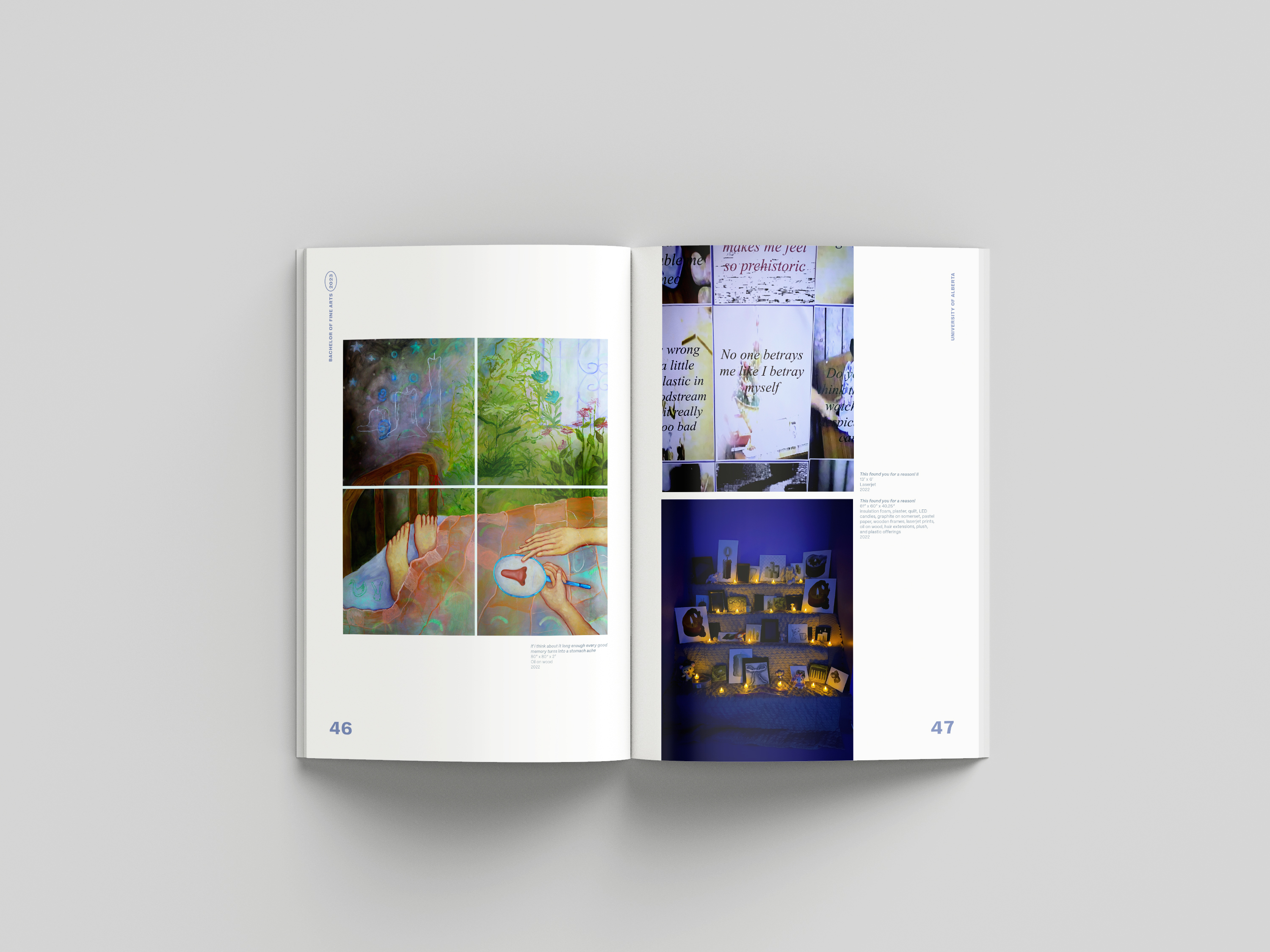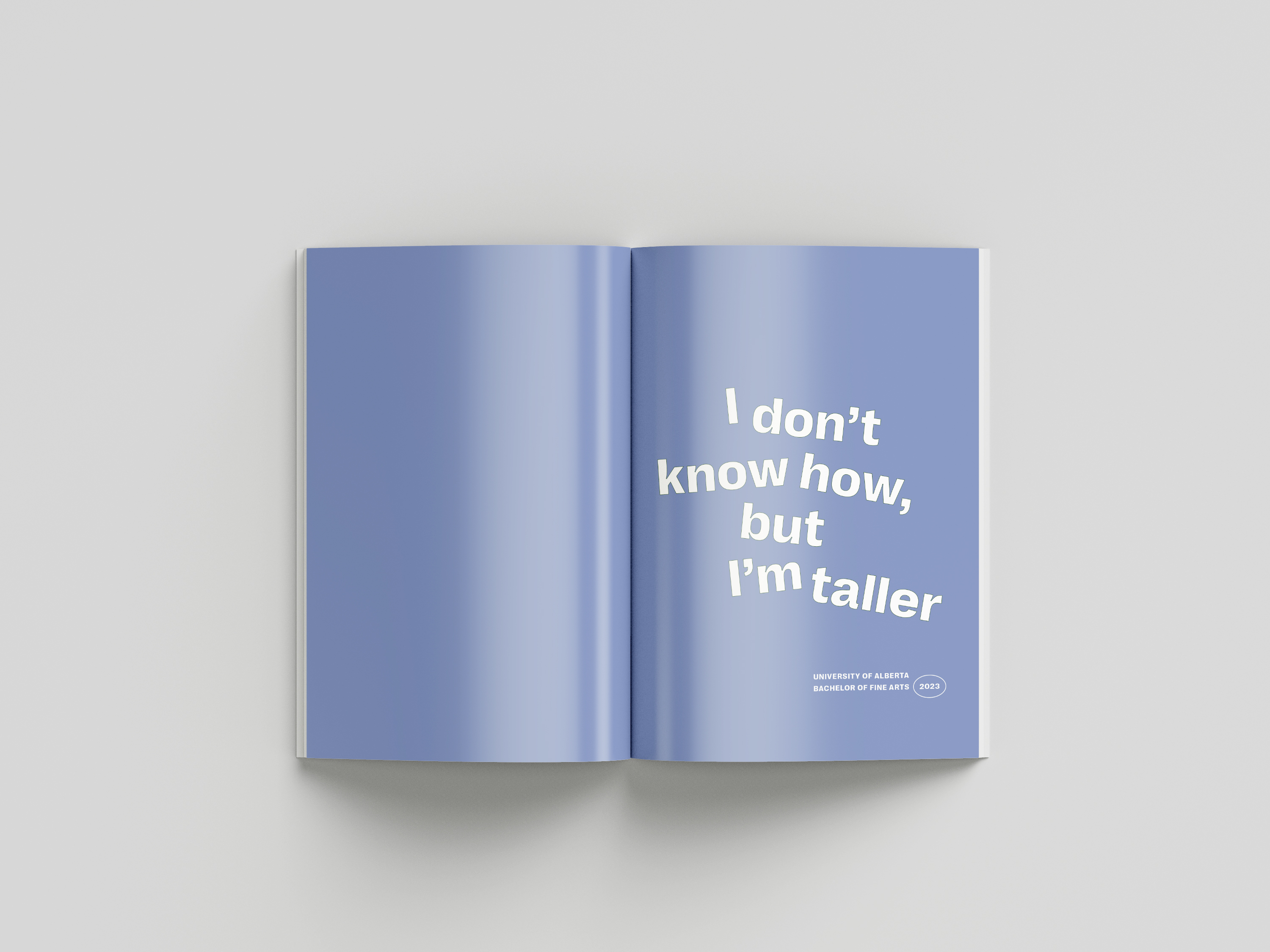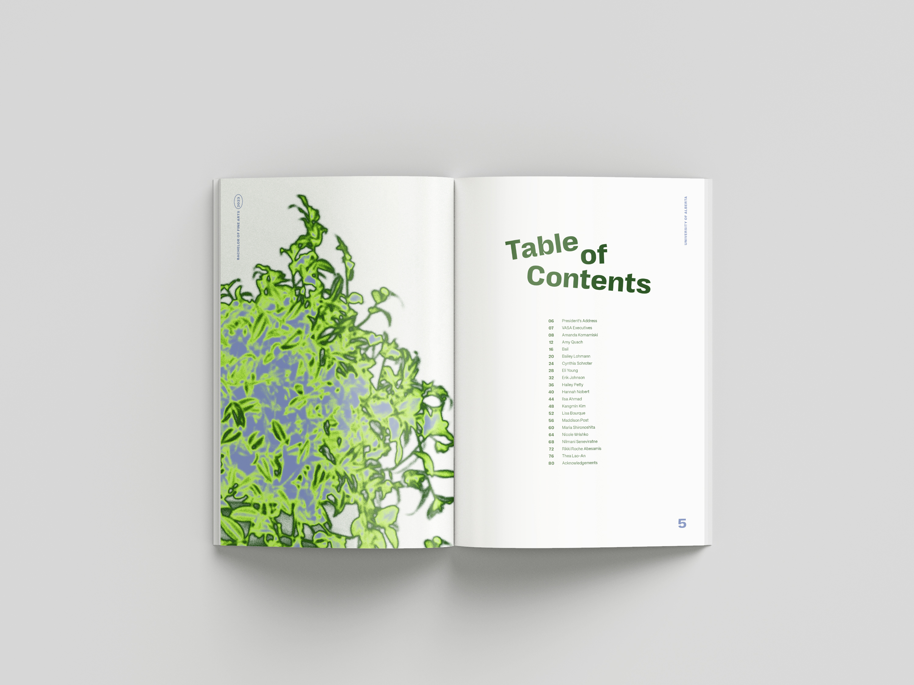 Exhibition catalog design for the 2023 graduating Bachelor of Fine Arts class at the University of Alberta. This project included designing an 84 page catalog, poster (digital and print), handbills (digital and print), and title vector for vinyl printing. During this project, I worked VASA grad coordinators and catalog liaison to create an exhibition design identity centered around themes of growth.
